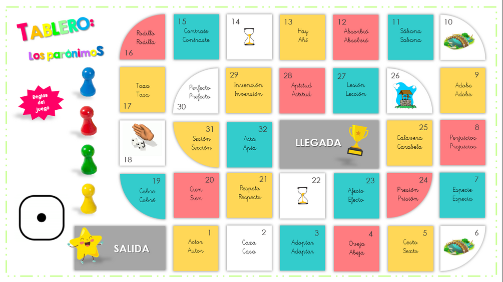 Tablero para aprender y/o repasar las palabras parónimas (vocabulario). Creado con la herramienta Power Point. ES EDITABLE.